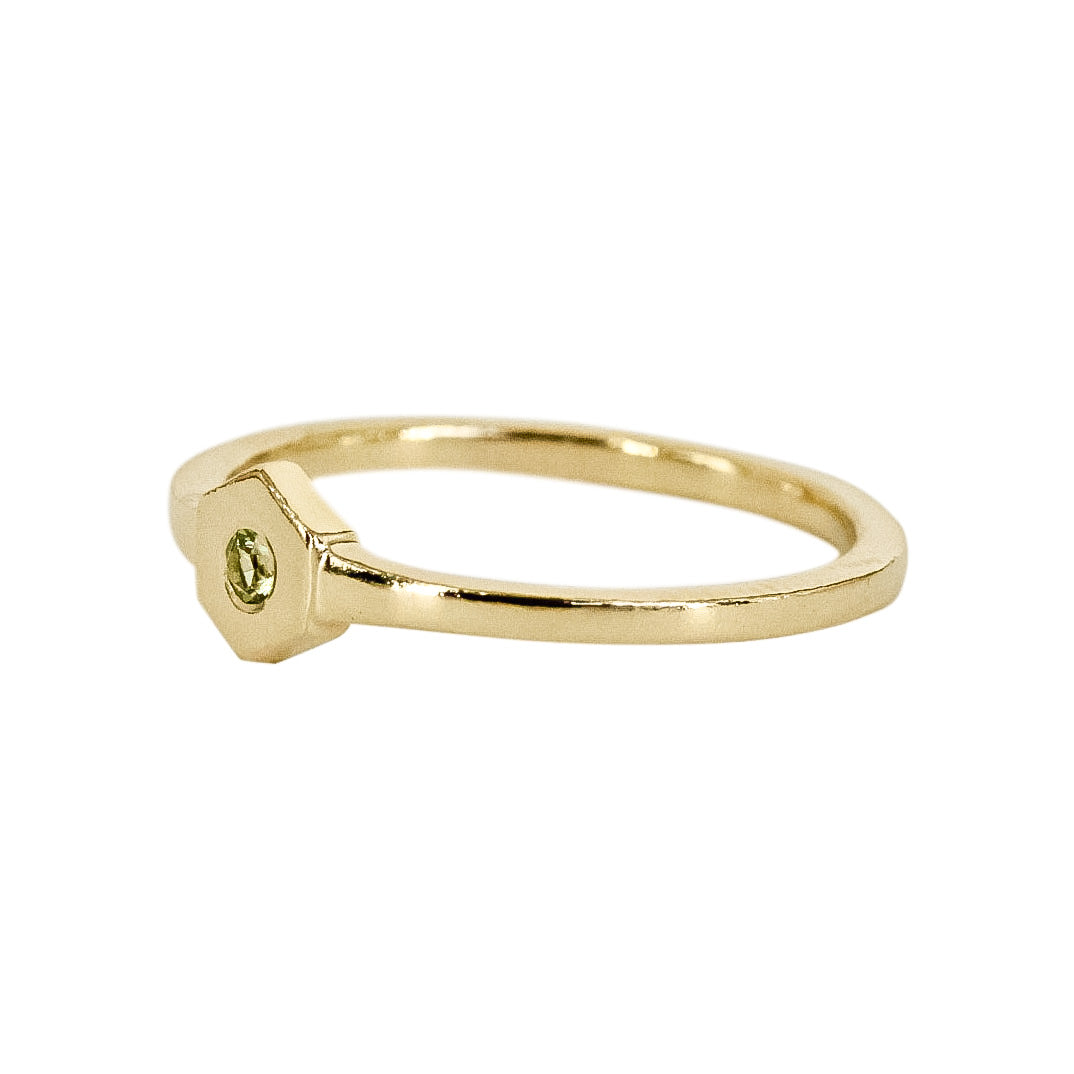Celebrate your birthday or the birthday of a loved one with this birthstone ring. Peridot is the birthstone for the month of August. Ancient wisdom states that peridot offers beauty to the wearer. Some believe that the naturally occurring shape of the hexagon is evidence of the divine in nature. I feel that the naturally powerful hexagon shape is the perfect setting for this gemstone.