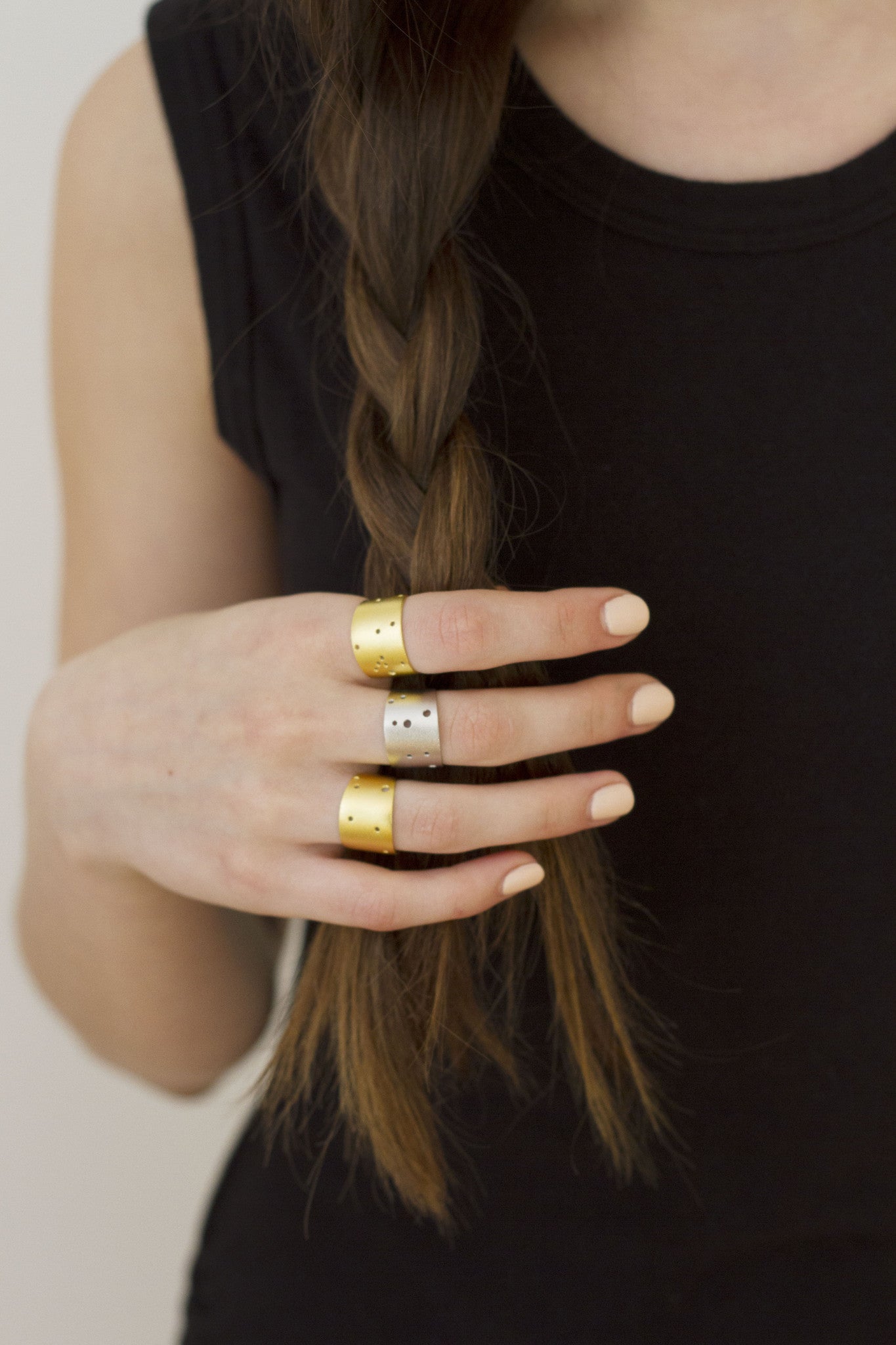 This piece symbolizes the constellation for each sign of the zodiac, intricately detailed according to a Swiss calendar from the 1900's. For each constellation, the back is etched with a 3-letter abbreviation of its corresponding sign. The rings are adjustable and comfortably fit sizes 5-8. Textured brass ring that is clad with 14k gold.