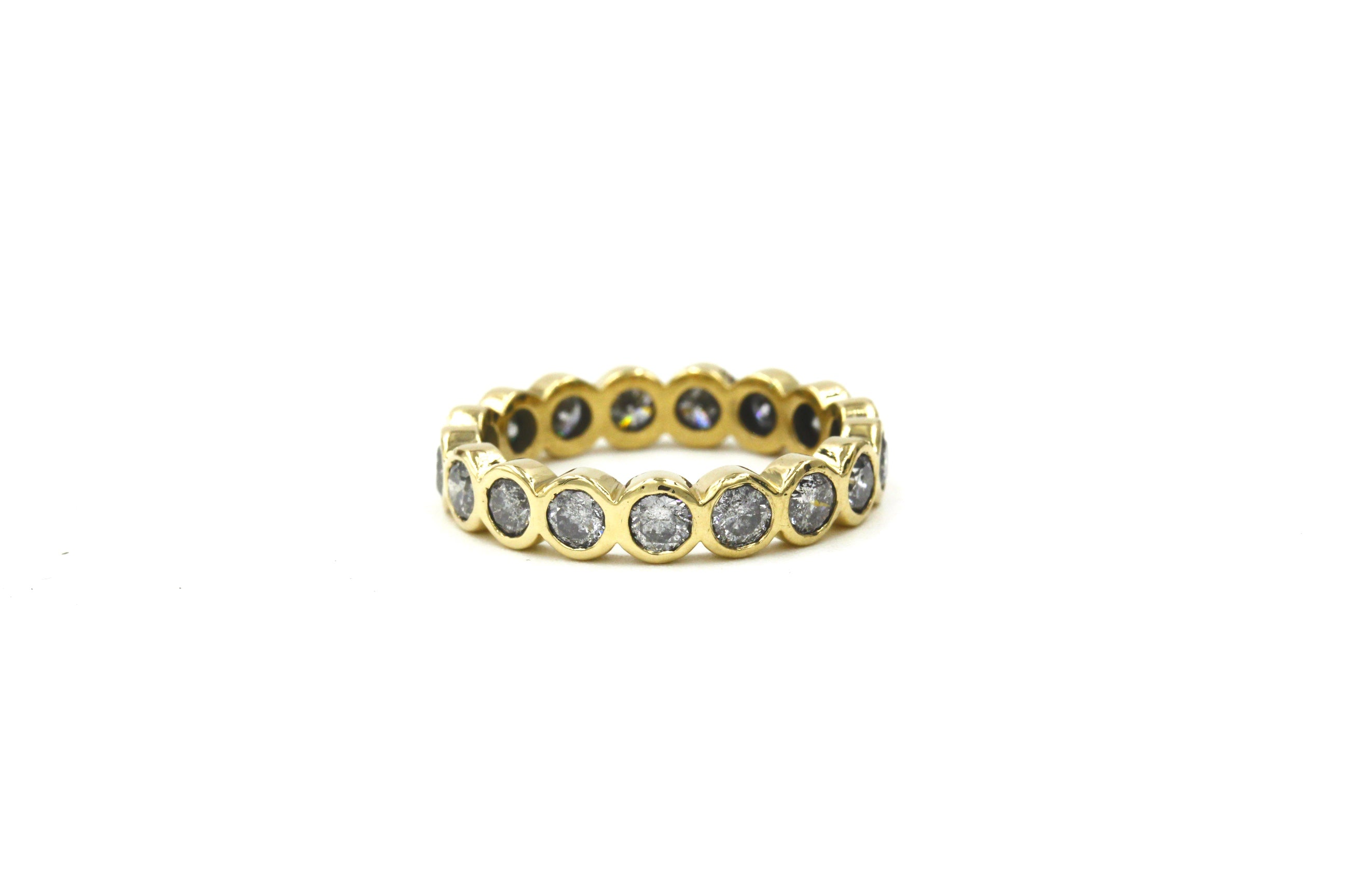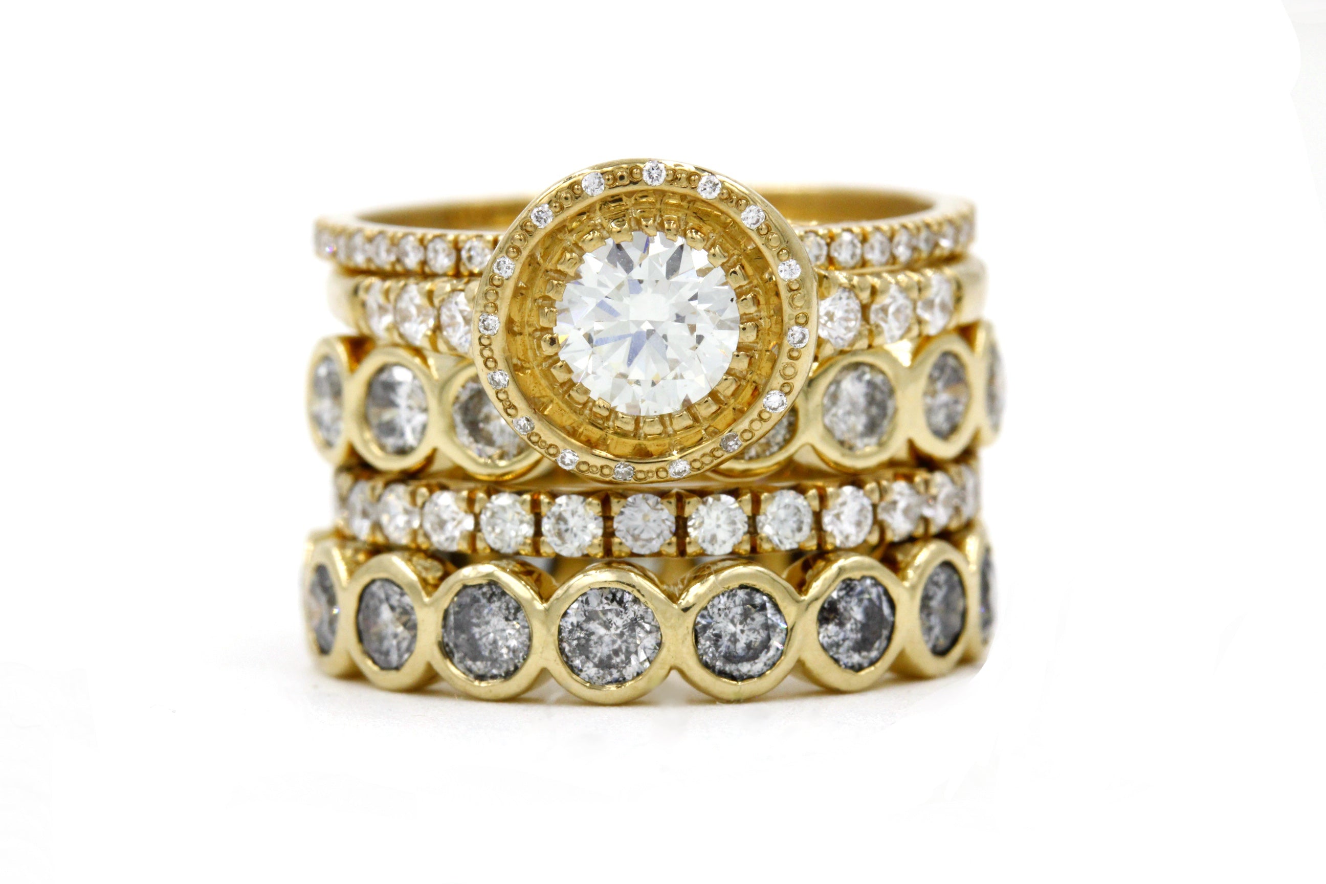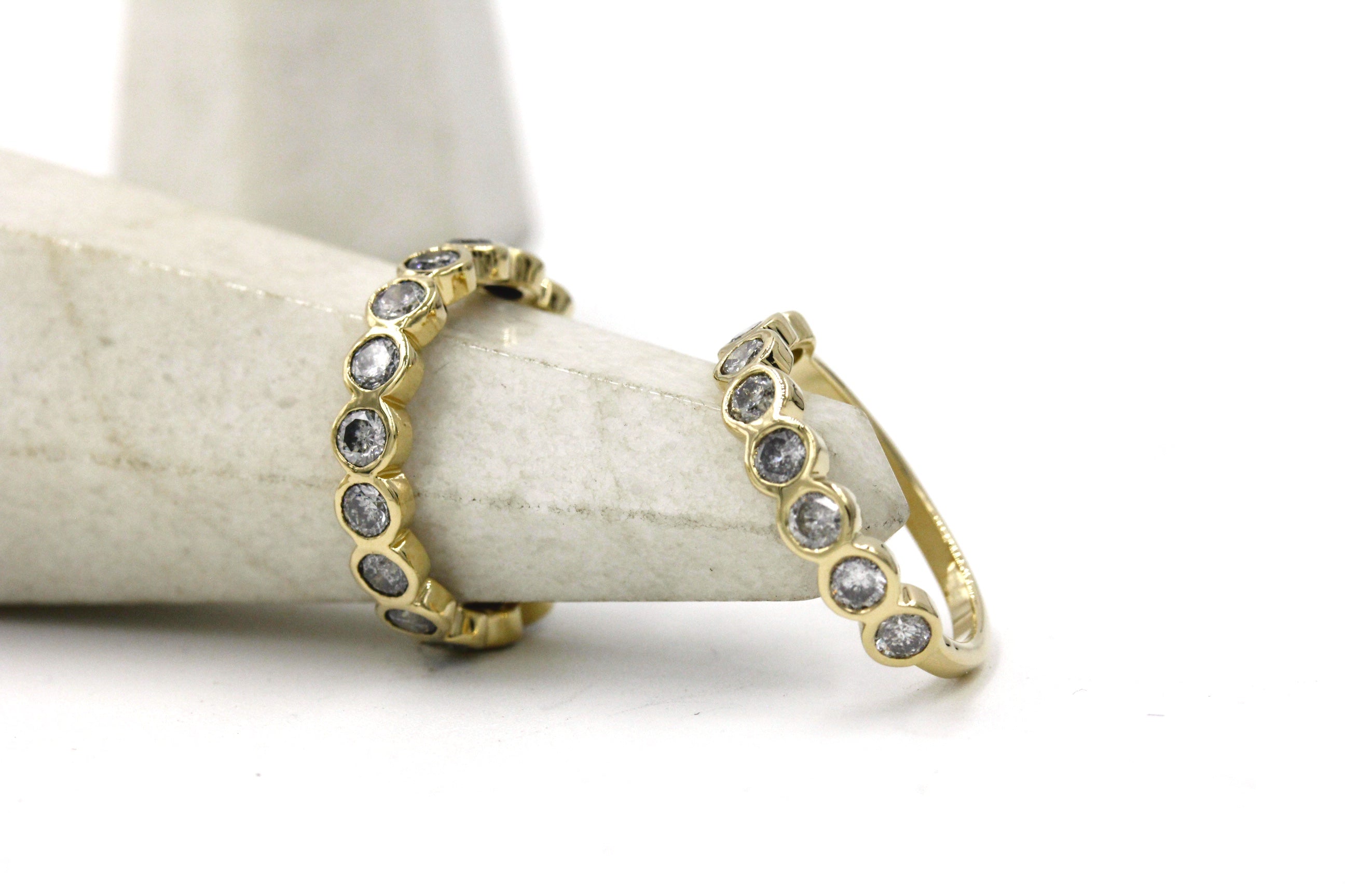 Introducing the Wallace Hammered Bezel Diamond Ring - the latest addition to our collection of ceremony/wedding band rings. Crafted with a 3mm diamond eternity band, this ring features a bezel setting with stunning gray (salt and pepper) diamonds. The bezel is lightly hammered for added brilliance. Versatile and stylish, this ring can be worn as a wedding band or stacked for everyday wear.