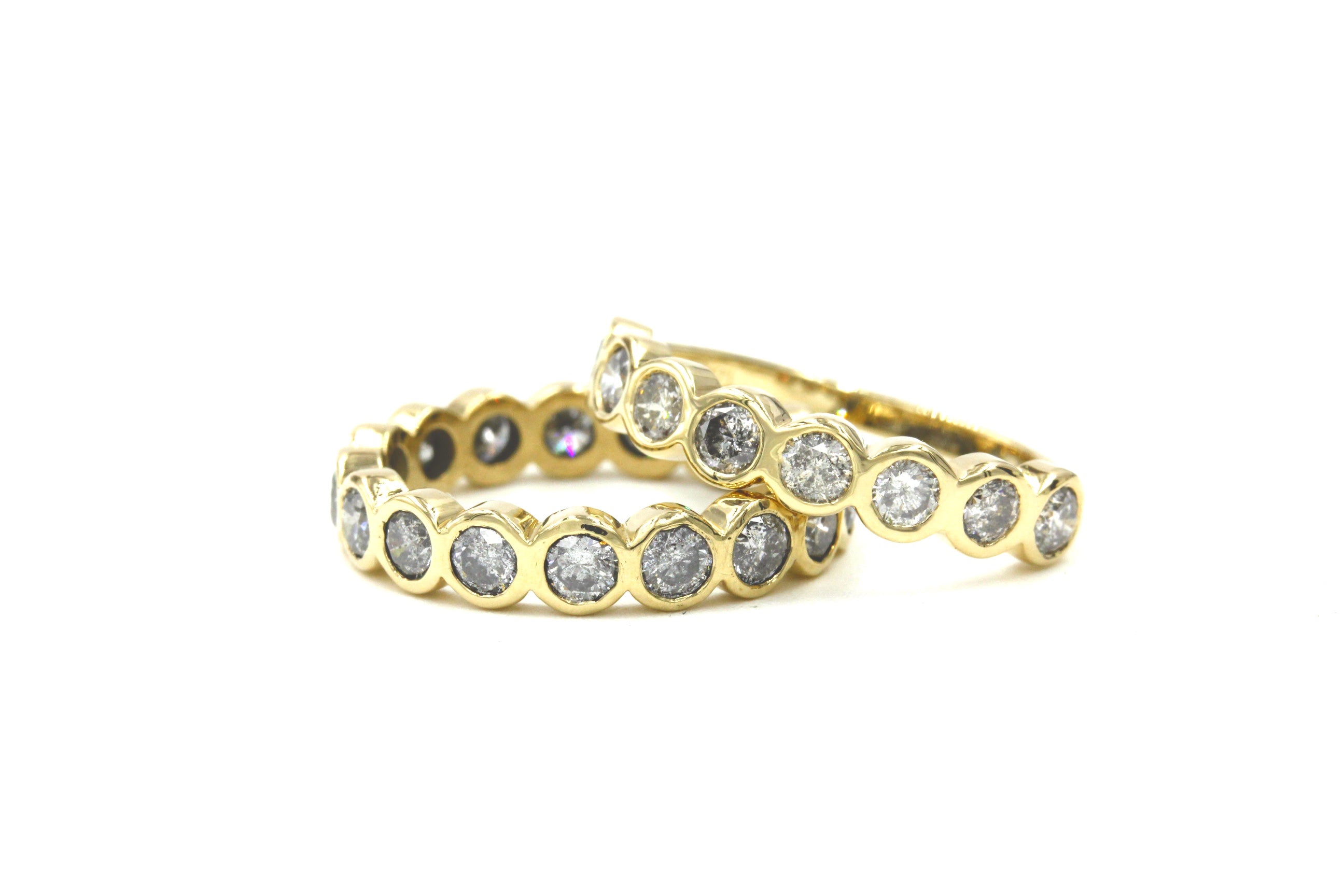 Available in 14k yellow or white gold, with options of 1.5mm (___ tcw) or 3mm (___ tcw) diamond sizes.